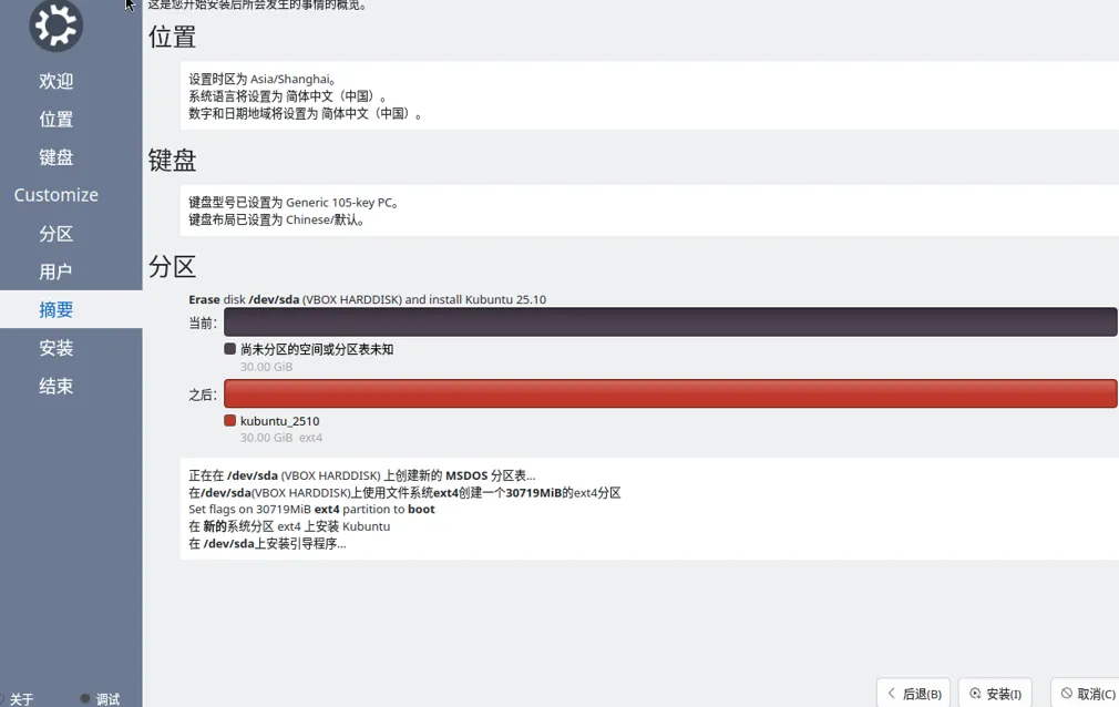 这里提供了一个摘要,可以完整的回顾检查自己的设置,如果有不合理的地方,可以回退后,再次调整设置。确认没有问题,就点安装。