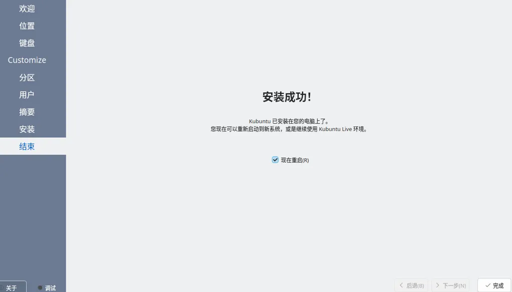 开始安装了,这个安装器还是挺快的,左下角提供调试工具,能方便有能力的用户对Kubuntu Linux出现问题的情况进行更详细的了解。
