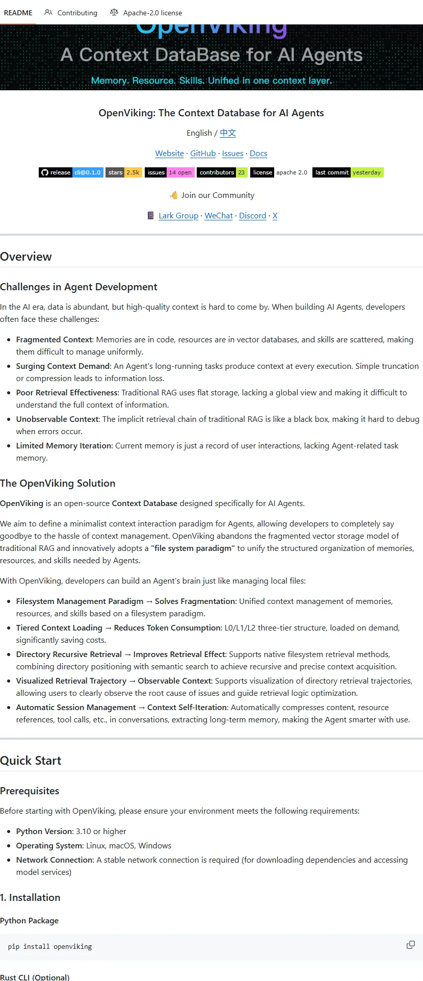 OpenViking 是一个面向 AI Agent 的开源上下文数据库,旨在解决当前智能体开发中上下文管理碎片化、检索低效、不可观测与缺乏自进化能力等核心痛点。