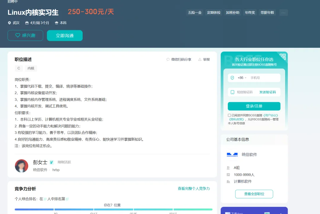 统信软件招4天/周3个月Linux内核实习生岗位,250-300元/天,工作地址:武汉江夏区武汉未来科技城B3座7至9层,面向本科及以上学历毕业生