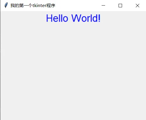 # 第一步:导入tkinter 同时给它起个别名tkimport tkinter as tk# 第二步:创建主窗口(就像准备一张画布)root = tk.Tk()# 设置窗口标题root.title("我的第一个tkinter程序")# 设置窗口大小root.geometry("400x300")# 第三步:创建一个标签,添加“Hello World”label = tk.Label(root, text="Hello World!", font=("Arial", 20), fg="blue")label.pack() # 把文字“打包”放到窗口里# 第四步:进入消息循环,让窗口保持显示root.mainloop()