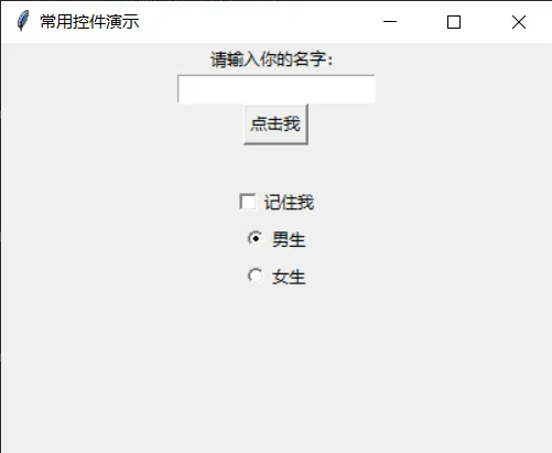 import tkinter as tkdef button_click(): """按钮点击事件处理函数""" name = entry.get() # 获取输入框的内容 # 修改标签文字 result_label.config(text=f"你好,{name}!") # 创建主窗口window = tk.Tk()window.title("常用控件演示")window.geometry("400x300")# 标签label1 = tk.Label(window, text="请输入你的名字:")label1.pack()# 输入框entry = tk.Entry(window, width=20)entry.pack()# 按钮button = tk.Button(window, text="点击我", command=button_click)button.pack()# 结果显示标签result_label = tk.Label(window, text="", font=("Arial", 14))result_label.pack()# 复选框var = tk.IntVar() # 用于存储复选框的状态check = tk.Checkbutton(window, text="记住我", variable=var)check.pack()# 单选框radio_var = tk.StringVar(value="男")radio1 = tk.Radiobutton(window, text="男生", variable=radio_var, value="男")radio2 = tk.Radiobutton(window, text="女生", variable=radio_var, value="女")radio1.pack()radio2.pack()window.mainloop()