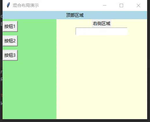import tkinter as tkwindow = tk.Tk()window.title("混合布局演示")window.geometry("400x300")# 顶部框架(使用pack)top_frame = tk.Frame(window)top_frame.pack(side=tk.TOP, fill=tk.X)tk.Label(top_frame, text="顶部区域", bg="lightblue").pack(fill=tk.X)# 左侧框架(使用grid)left_frame = tk.Frame(window, bg="lightgreen")left_frame.pack(side=tk.LEFT, fill=tk.BOTH, expand=True)for i in range(3): tk.Button(left_frame, text=f"按钮{i+1}").grid(row=i, column=0, pady=5)# 右侧框架(使用pack)right_frame = tk.Frame(window, bg="lightyellow")right_frame.pack(side=tk.RIGHT, fill=tk.BOTH, expand=True)tk.Label(right_frame, text="右侧区域").pack()tk.Entry(right_frame).pack()window.mainloop()