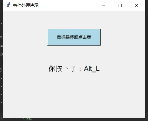 tkinter的事件处理比简单的command参数更强大。通过bind方法,可以捕获各种用户操作。示例代码: