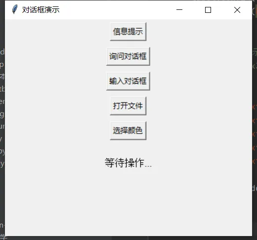 import tkinter as tkfrom tkinter import messagebox, simpledialog, filedialog, colorchooserdef show_info(): """显示信息对话框""" messagebox.showinfo("提示", "这是一条信息")def ask_question(): """显示询问对话框""" result = messagebox.askyesno("确认", "你确定要退出吗?") if result: label.config(text="用户选择了:是") else: label.config(text="用户选择了:否")def get_input(): """显示输入对话框""" name = simpledialog.askstring("输入", "请输入你的名字:") if name: label.config(text=f"你好,{name}!")def open_file(): """显示文件选择对话框""" filename = filedialog.askopenfilename( title="选择文件", filetypes=[("文本文件", "*.txt"), ("所有文件", "*.*")] ) if filename: label.config(text=f"选择了:{filename}")def choose_color(): """显示颜色选择对话框""" color = colorchooser.askcolor(title="选择颜色") if color[1]: # color[1]是颜色的十六进制表示 label.config(text=f"选择了颜色:{color[1]}") label.config(bg=color[1])window = tk.Tk()window.title("对话框演示")window.geometry("400x300")# 创建各个按钮tk.Button(window, text="信息提示", command=show_info).pack(pady=5)tk.Button(window, text="询问对话框", command=ask_question).pack(pady=5)tk.Button(window, text="输入对话框", command=get_input).pack(pady=5)tk.Button(window, text="打开文件", command=open_file).pack(pady=5)tk.Button(window, text="选择颜色", command=choose_color).pack(pady=5)label = tk.Label(window, text="等待操作...", font=("Arial", 12))label.pack(pady=20)window.mainloop()