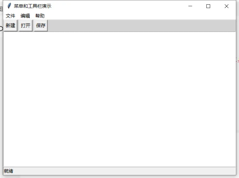 import tkinter as tkfrom tkinter import messageboxclass Application: def __init__(self): self.window = tk.Tk() self.window.title("菜单和工具栏演示") self.window.geometry("600x400") self.create_menu() self.create_toolbar() self.create_statusbar() # 主内容区域 self.text = tk.Text(self.window) self.text.pack(fill=tk.BOTH, expand=True) def create_menu(self): """创建菜单栏""" menubar = tk.Menu(self.window) # 文件菜单 file_menu = tk.Menu(menubar, tearoff=0) file_menu.add_command(label="新建", command=self.new_file, accelerator="Ctrl+N") file_menu.add_command(label="打开", command=self.open_file) file_menu.add_separator() file_menu.add_command(label="退出", command=self.window.quit) menubar.add_cascade(label="文件", menu=file_menu) # 编辑菜单 edit_menu = tk.Menu(menubar, tearoff=0) edit_menu.add_command(label="剪切", command=self.cut) edit_menu.add_command(label="复制", command=self.copy) edit_menu.add_command(label="粘贴", command=self.paste) menubar.add_cascade(label="编辑", menu=edit_menu) # 帮助菜单 help_menu = tk.Menu(menubar, tearoff=0) help_menu.add_command(label="关于", command=self.about) menubar.add_cascade(label="帮助", menu=help_menu) self.window.config(menu=menubar) # 绑定快捷键 self.window.bind("<Control-n>", lambda e: self.new_file()) def create_toolbar(self): """创建工具栏""" toolbar = tk.Frame(self.window, bg="lightgray", height=30) toolbar.pack(side=tk.TOP, fill=tk.X) # 简单的工具栏按钮 tk.Button(toolbar, text="新建", command=self.new_file).pack(side=tk.LEFT, padx=2) tk.Button(toolbar, text="打开", command=self.open_file).pack(side=tk.LEFT, padx=2) tk.Button(toolbar, text="保存", command=self.save).pack(side=tk.LEFT, padx=2) def create_statusbar(self): """创建状态栏""" self.statusbar = tk.Label(self.window, text="就绪", bd=1, relief=tk.SUNKEN, anchor=tk.W) self.statusbar.pack(side=tk.BOTTOM, fill=tk.X) def new_file(self): self.text.delete(1.0, tk.END) self.statusbar.config(text="新建文件") def open_file(self): self.statusbar.config(text="打开文件") def save(self): self.statusbar.config(text="保存文件") def cut(self): self.text.event_generate("<<Cut>>") def copy(self): self.text.event_generate("<<Copy>>") def paste(self): self.text.event_generate("<<Paste>>") def about(self): messagebox.showinfo("关于", "这是一个菜单和工具栏演示程序") def run(self): self.window.mainloop()if __name__ == "__main__": app = Application() app.run()