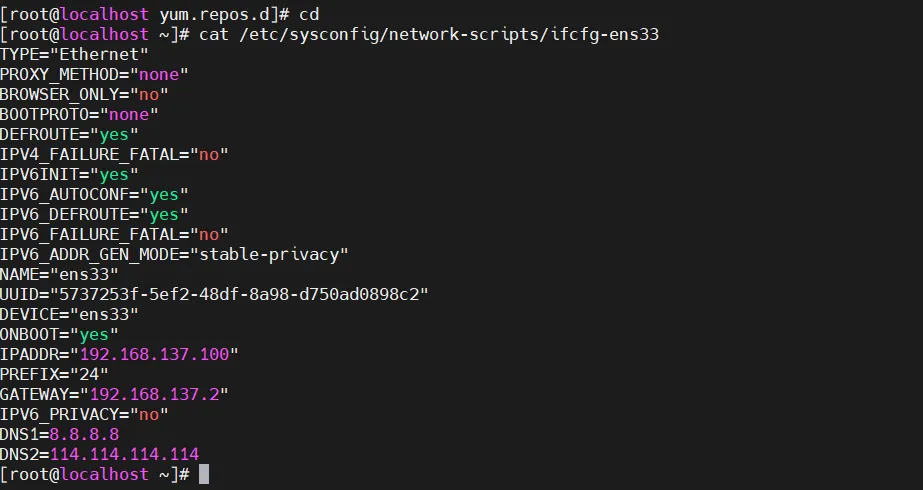 TYPE="Ethernet"PROXY_METHOD="none"BROWSER_ONLY="no"BOOTPROTO="static"DEFROUTE="yes"IPV4_FAILURE_FATAL="no"NAME="ens33"DEVICE="ens33"ONBOOT="yes"IPADDR="192.168.137.100"PREFIX="24"GATEWAY="192.168.137.2"IPV6_PRIVACY="no"DNS1=8.8.8.8DNS2=114.114.114.114
