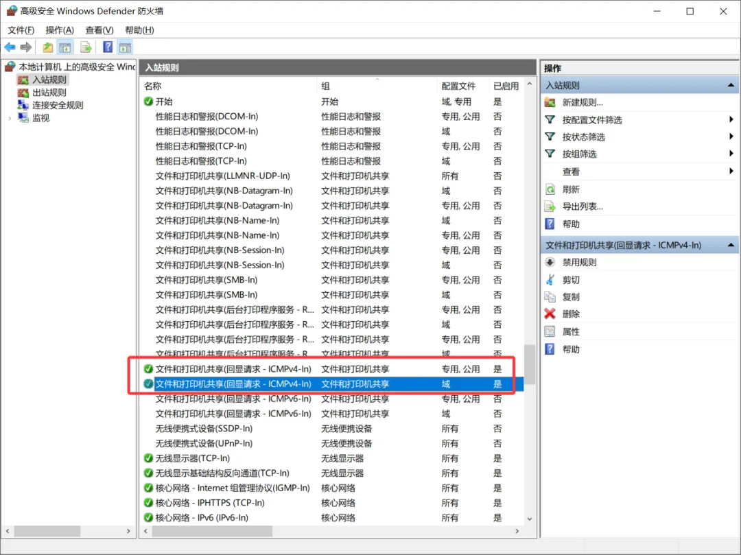 启用名为 “文件和打印机共享 (回显请求 - ICMPv4-In)” 的规则