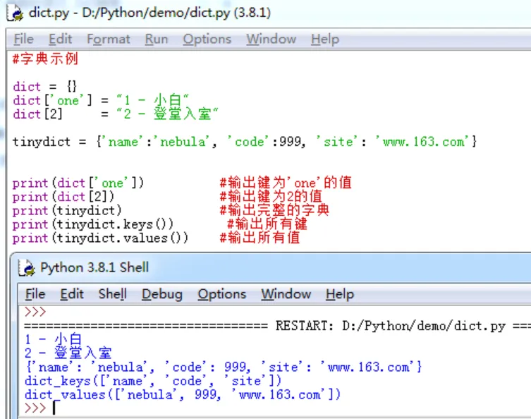 集合(set)是由一个或数个形状各异的大小整体组成的,构成集合的事物或对象称为元素或是成员。可以使用大括号{}或者set()函数创建集合,注意:创建一个空集合必须用set()而不是{},因为{}是用来创建一个空字典。 parameter = {value01, value02, ...}7、Dictionary(字典)