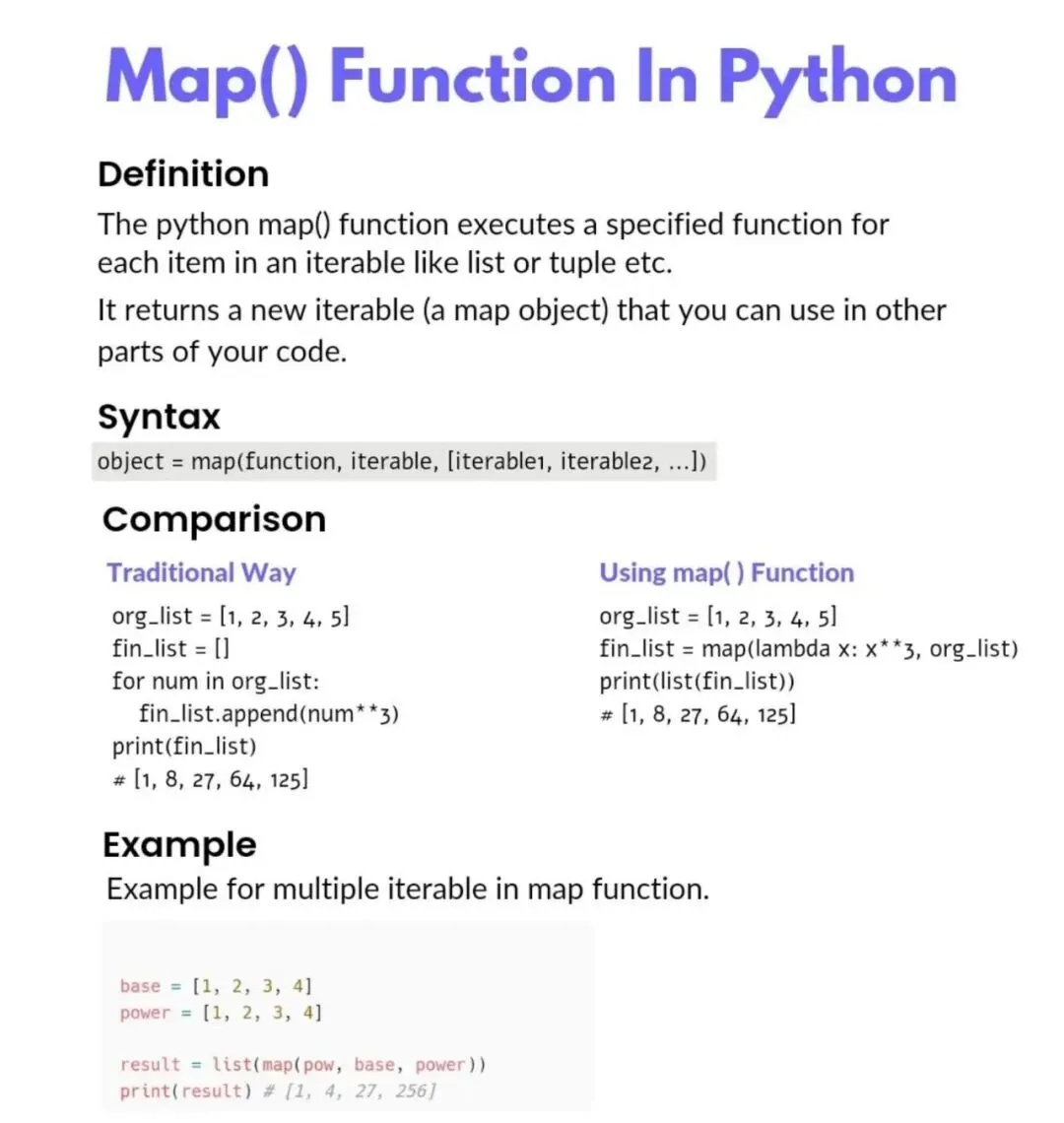 定义:map()函数用于将一个指定的函数应用到可迭代对象(如列表、元组等)的每个元素上,并返回一个新的可迭代对象(即map对象)。