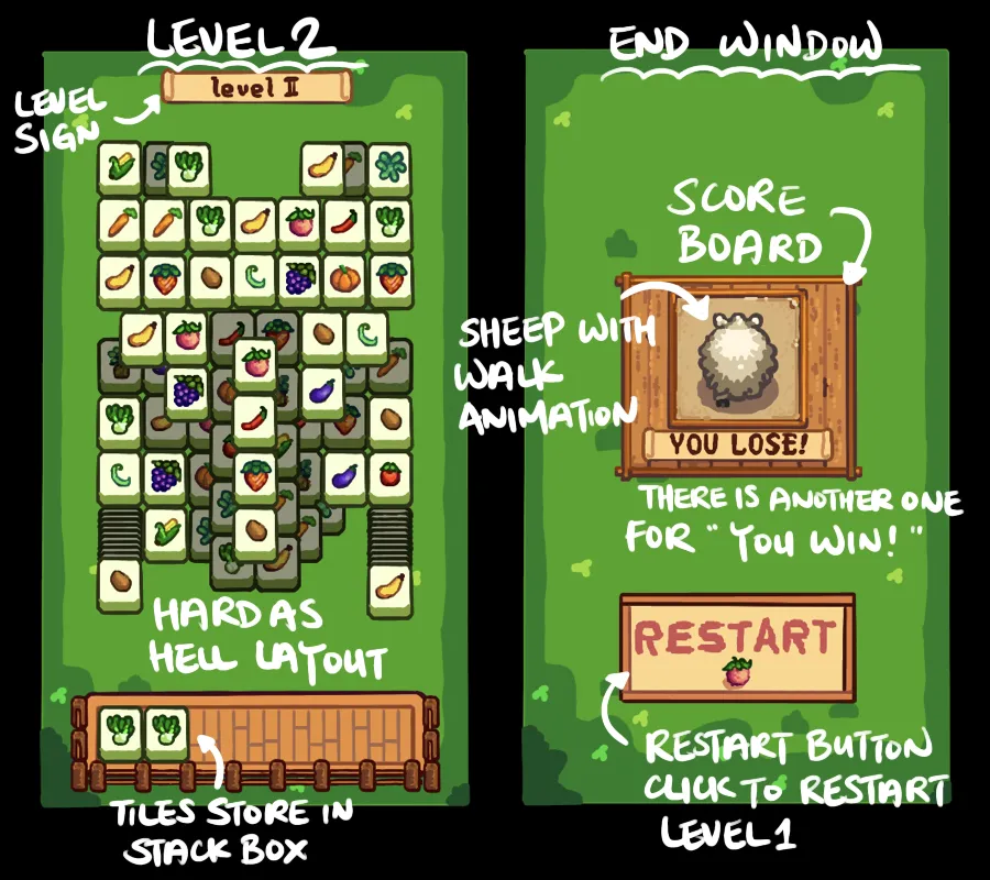 整体来说,保留了游戏原本的结构和玩法,但在细节处做了一些调整。比如绘画风格借鉴了星露谷物语,全部都做成了像素风。再比如简化掉了重置和洗牌的功能(emmm……其实是我太懒了,不想做了)。