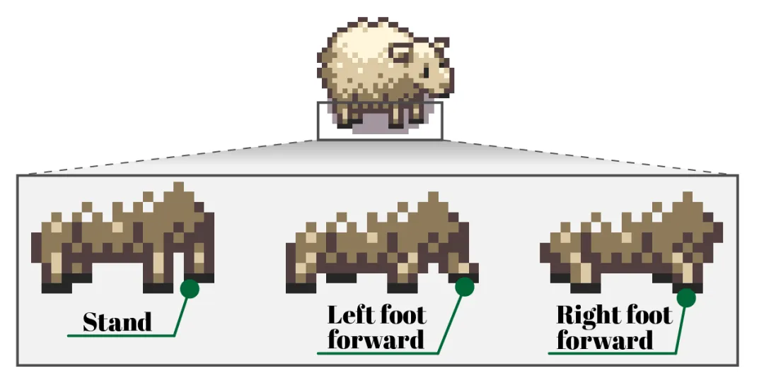 接着,为了画好每一帧,我需要分析绵羊的动作,总共可以分为以下几步: