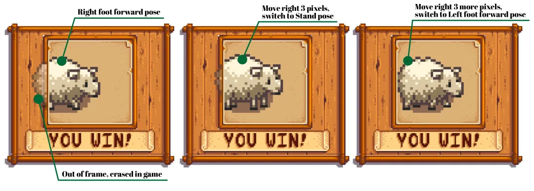 比如说结束界面的分数板。我希望WIN的分数板上,那只绵羊会一步步走到画框中间,低头,抬头,再眨眨眼睛卖个萌,最后慢慢走出画框。
