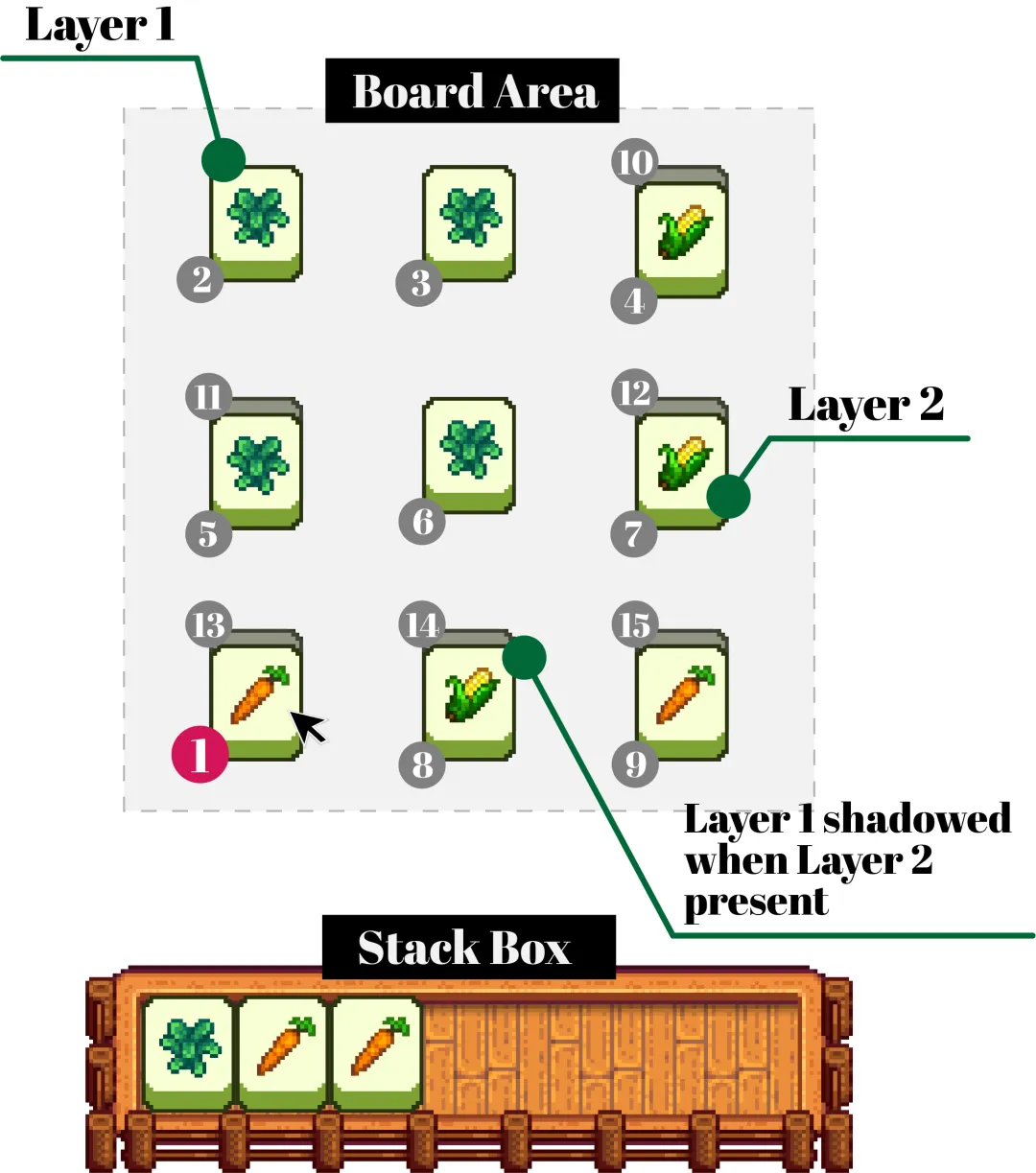 如上图,现在鼠标点击的位置是 (1,5),在这个位置上有两张卡片:1号卡片 (tile1) 位于上层,13号卡片(tile13) 位于下层。此时,只有1号卡片会被选中,即将进入飞行模式。