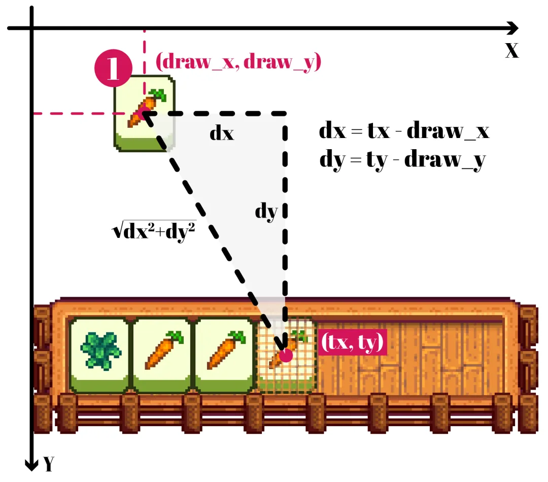 因此,1号卡片需要在x轴上运行dx = tx - draw_x, 在y轴上运行dy = ty - draw_y. 根据勾股定理,它运行的实际距离为dist = (dx*dx + dy*dy) ** 0.5. (多年未见的勾股定理又向我们走来了。所以说,数学还是有用的嘛……)
