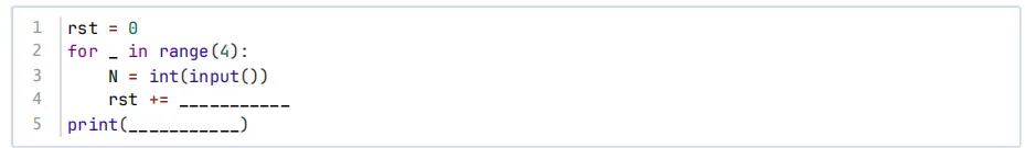 第6 题 某单位工号的编码规则:编码总长5位,均为数字,前4位依次整除以3,其值累加之和除以10的余数为第5位数字。如某工号为76587,前4位分别整除3后,商分别为2、2、1、2,其累加之和为7,除以10的余数为7,故第5位为7。下面的程序依次输入前4位数字,并计算输出最后一位。程序逐行输入前4位数字,要输出第5位数字。则在横线处应填上的代码是( )。