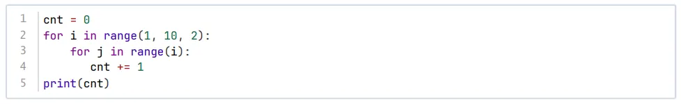 内层循环i次,每次cnt加1,所以只要知道外层的i依次是多少就可以知道cnt加了多少次1,而外层循环依次为1、3、5、7、9,所以cnt=1+3+5+7+9=25,因此正确选项是D。