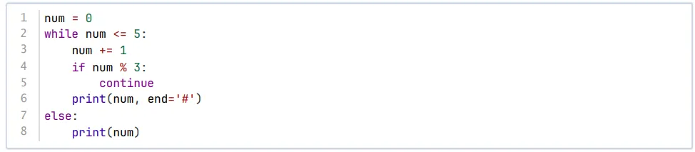 【解析】循环中num依次为1~6,只有当num为3、6时不满足第4行if条件,输出3#6#,循环不是break结束的所以会执行第7行else部分输出num的值为6,因此正确选项是B。