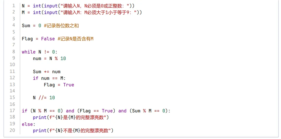 第13 题 漂亮数的定义是:如果N能被M整除,或者某位是M,或者N的每位数之和能被M整除,则说N是M的漂亮数。如果三个条件都满足,则是完整漂亮数。123是3的完整漂亮数,因为123能被3整除,也含有3,其每位数之和为6也能被3整除。下面的代码用于判断N是否为M的完整漂亮数并输出。相关说法正确的是( )。