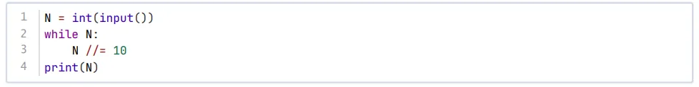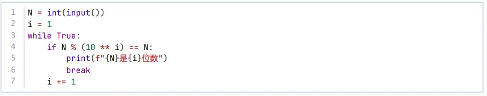 变量i用于记录位数,循环中每次判断N%(10**i)==N即判断N<10i是否首次成立,如果成立说明N的位数为i,如果不成立,说明N 至少有 i+1位,于是 i++,继续循环