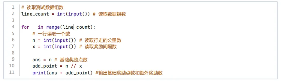 通过input()读入数据、并通过int()将line_count转成int类型,循环line_count次表示line_count组数据,循环内按相同的方式处理每次输入的n和x,用ans变量记录基础能量为n公里数,用add_point变量记录奖励能量,其值为n//x,因为python中//本身就是向下取整,所以不需要其他操作,最后输出基础能量+奖励能量,python中print输出时默认是换行