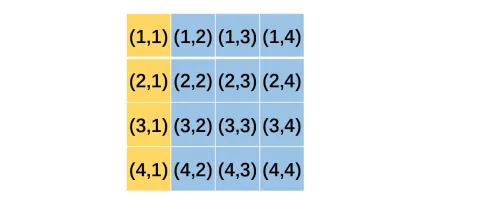 图中标注为黄色的四个格子是黄金格,坐标分别为(1,1),(2,1),(3,1),(4,1)。