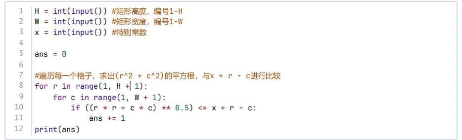 根据题目要求通过input()输入H,W,x,并通过int()转为整型,用ans变量记录满足条件的(r,c)数量,初始为0,双重循环遍历行H和列W,判断是否满足黄金格的条件即(r*r+c*c)**0.5<=x+r-c,满足条件则ans变量增加1,表示多了1组满足条件的(r,c)数量,双重循环结束后,输出ans的值