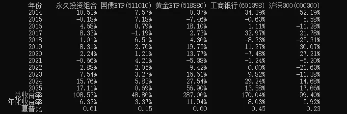 1)2014-2025周期内,“永久投资组合”总收益108.53%,年化收益6.32%,跑赢了沪深300的5.92%,同时也可以跑赢最近10年2%左右的通胀率。