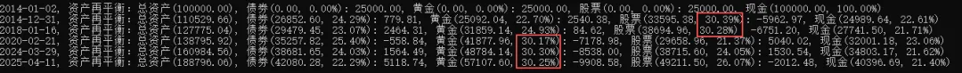 4)资产再平衡选择阈值策略,按照±5%来调整,即:>=30%或<=20% 时,卖出或买入相应的部分,重新归于平衡;