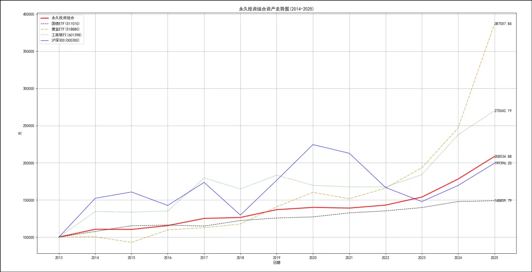 回测周期选取:2014.01.01 -- 2025.12.31,时间跨度为12年。选取这个跨越2015年大牛市的时间段,刚好可以验证“永久投资组合”穿越“牛熊”的能力。