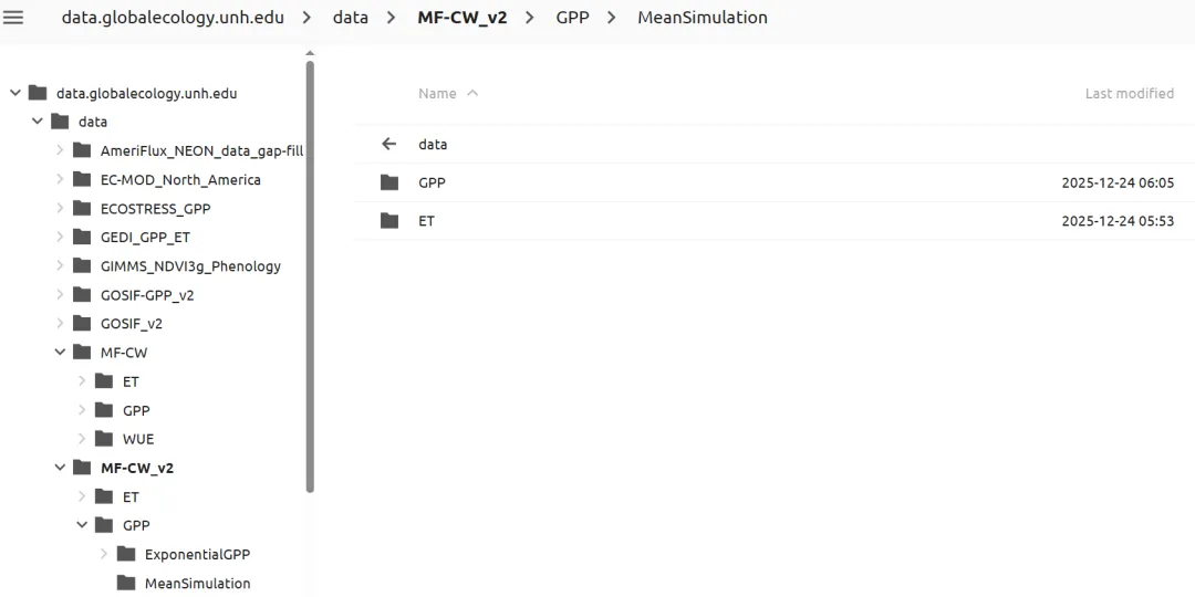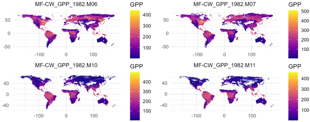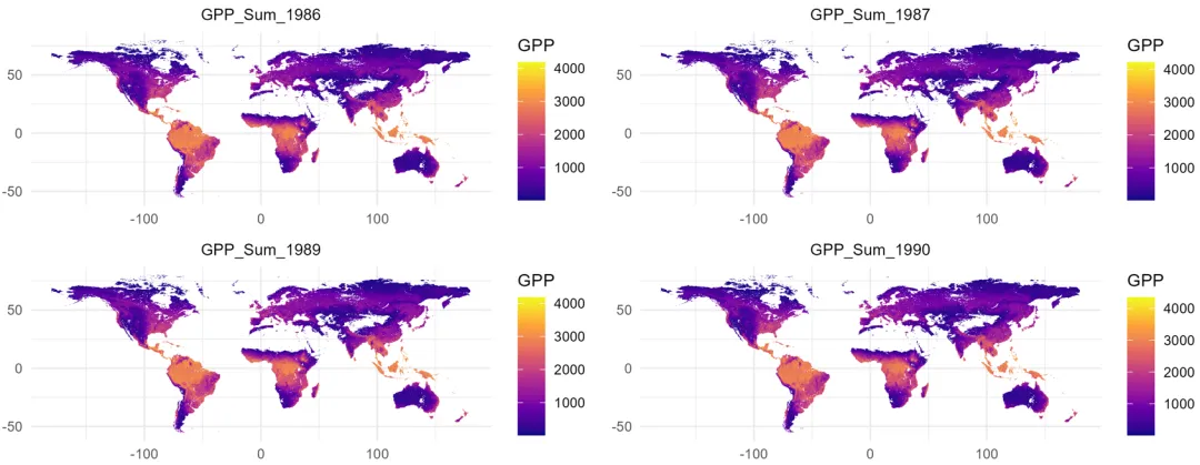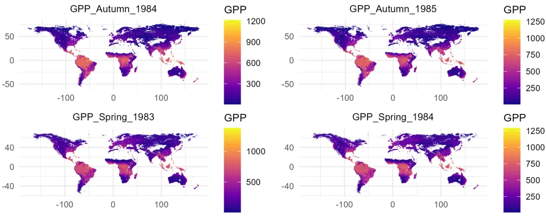 import osimport requestsimport numpy as npimport rasteriofrom io import BytesIObase_url = "https://data.globalecology.unh.edu/data/MF-CW_v2/GPP/MeanSimulation/"save_dir = r"D:\MF_CW\GPP"annual_dir = os.path.join(save_dir, "Annual_Sum")season_dir = os.path.join(save_dir, "Season_Sum")for d in [save_dir, annual_dir, season_dir]: if not os.path.exists(d): os.makedirs(d)for year in range(1982, 1991): year_data = {} meta = None for month in range(1, 13): file_name = f"MF-CW_GPP_{year}.M{month:02d}.tif" url = base_url + file_name local_path = os.path.join(save_dir, file_name) try: r = requests.get(url, timeout=30) if r.status_code == 200: with rasterio.open(BytesIO(r.content)) as src: data = src.read(1).astype("float32") if meta is None: meta = src.meta.copy() data[data <= 0] = np.nan meta.update(dtype="float32", nodata=np.nan) with rasterio.open(local_path, "w", **meta) as dst: dst.write(data, 1) year_data[month] = data except: pass if len(year_data) == 12: stacked = np.stack([year_data[m] for m in range(1, 13)]) annual_sum = np.nansum(stacked, axis=0) annual_sum[np.all(np.isnan(stacked), axis=0)] = np.nan with rasterio.open(os.path.join(annual_dir, f"GPP_Annual_{year}.tif"), "w", **meta) as dst: dst.write(annual_sum.astype("float32"), 1) spring = np.stack([year_data[m] for m in [3, 4, 5]]) summer = np.stack([year_data[m] for m in [6, 7, 8]]) autumn = np.stack([year_data[m] for m in [9, 10, 11]]) spring_sum = np.nansum(spring, axis=0) summer_sum = np.nansum(summer, axis=0) autumn_sum = np.nansum(autumn, axis=0) spring_sum[np.all(np.isnan(spring), axis=0)] = np.nan summer_sum[np.all(np.isnan(summer), axis=0)] = np.nan autumn_sum[np.all(np.isnan(autumn), axis=0)] = np.nan with rasterio.open(os.path.join(season_dir, f"GPP_Spring_{year}.tif"), "w", **meta) as dst: dst.write(spring_sum.astype("float32"), 1) with rasterio.open(os.path.join(season_dir, f"GPP_Summer_{year}.tif"), "w", **meta) as dst: dst.write(summer_sum.astype("float32"), 1) with rasterio.open(os.path.join(season_dir, f"GPP_Autumn_{year}.tif"), "w", **meta) as dst: dst.write(autumn_sum.astype("float32"), 1)print("All tasks completed.")