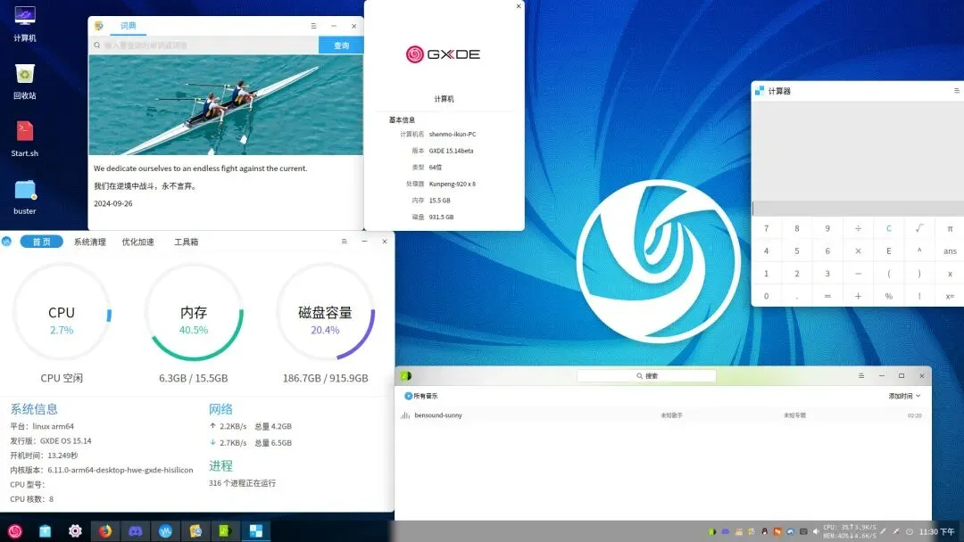 GXDE OS 复刻 Deepin 15 经典界面,保留启动器、任务栏、控制中心等标志性元素,满足老用户情怀需求。