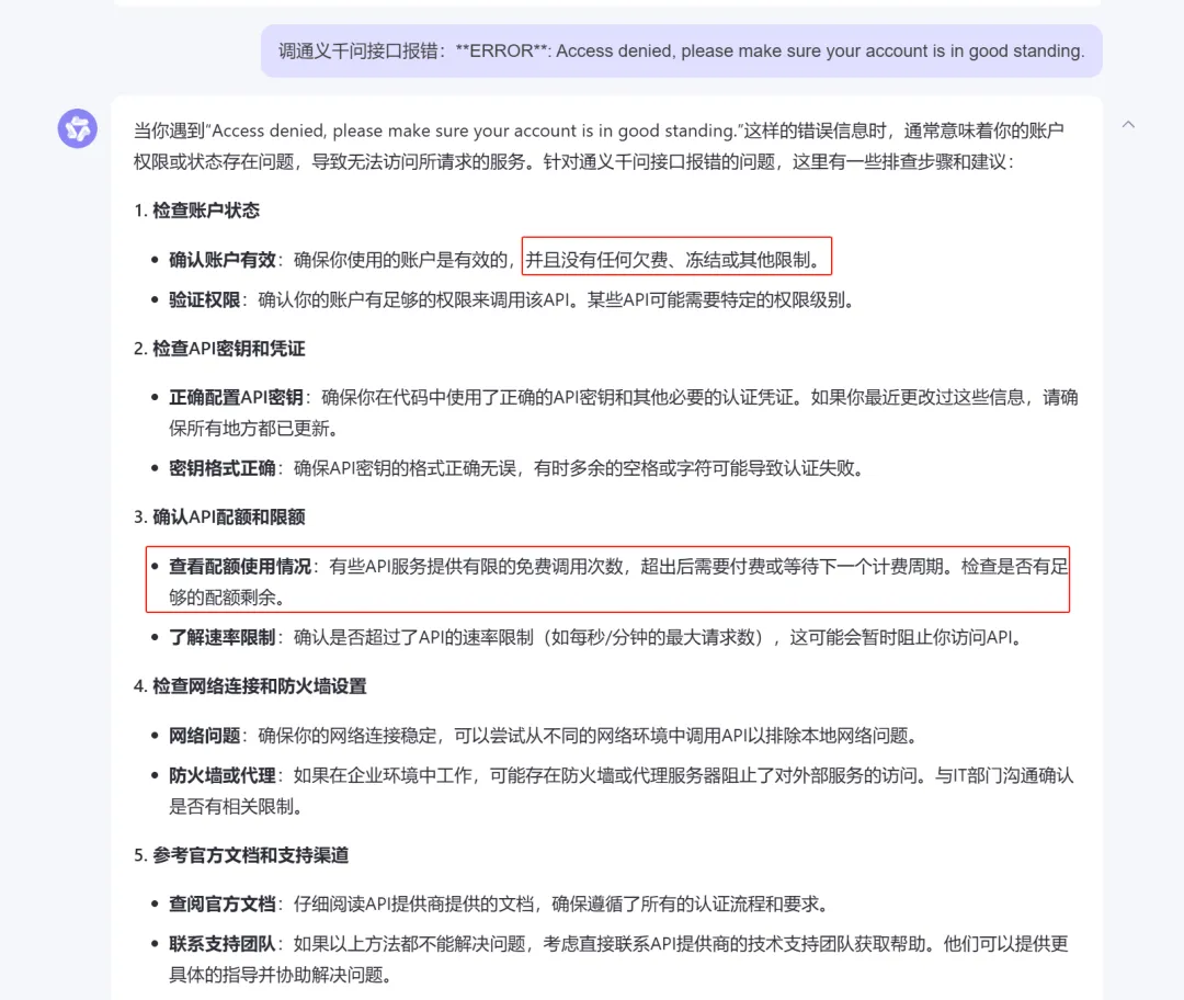 注:找到原因了,返回的是字符串。需要处理一下子。现在通义千问报错,应该是没钱了,先暂停。问AI回复如下: