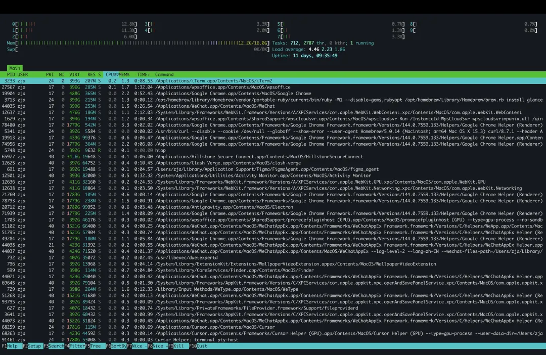 htop:top 的究极进化版,也是无数运维和开发的心头好。它不仅支持鼠标点击操作,还能以直观的彩色进度条展示每个 CPU 核心的使用情况。