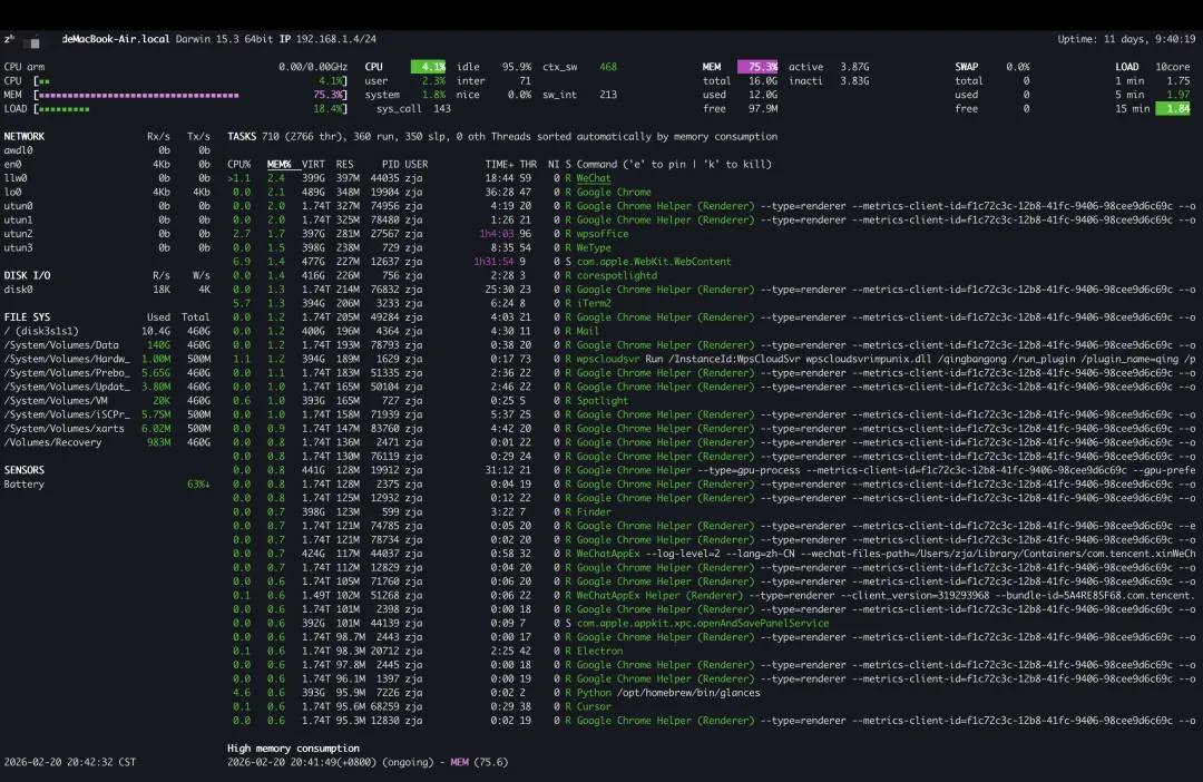 - • 这是一个基于 Python 开发的跨平台系统监视工具。它试图将系统所有维度的信息(CPU、内存、负载、I/O、网络流量、甚至温度)塞进一个终端屏幕里,并且会用不同的颜色(绿、黄、红)来警告你潜在的瓶颈在哪。如果只能装一个工具,装它准没错。