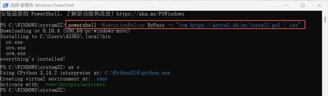 你唯一需要手动完成的,就是 “以管理员身份运行” PowerShell,然后输入下面命令,完成uv的全局安装,如下图所示。