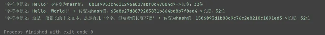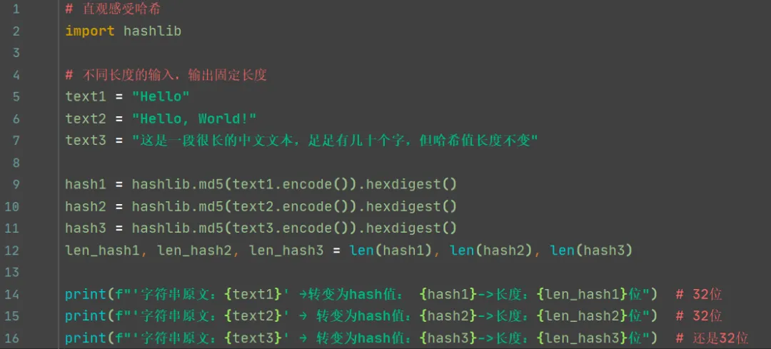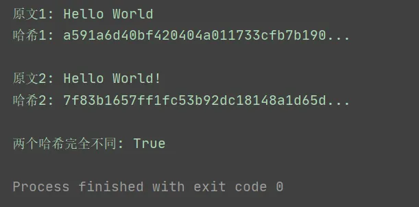哈希算法(Hash Algorithm) 是一种将任意长度的输入数据,通过数学函数转换为固定长度输出(哈希值)的算法。这个输出就像数据的“数字指纹”——不同输入几乎不可能得到相同的输出。最简单的理解:哈希算法就是一个“榨汁机”——你放进整个水果(任意数据),出来的是固定容量的果汁(固定长度哈希值),并且无法从果汁还原出完整的水果。从以上结果可以看出,无论原字符串是什么内容,转变为hash值后都是32位。2.2 哈希算法的四大核心特性
