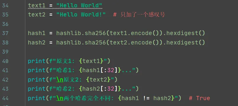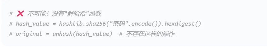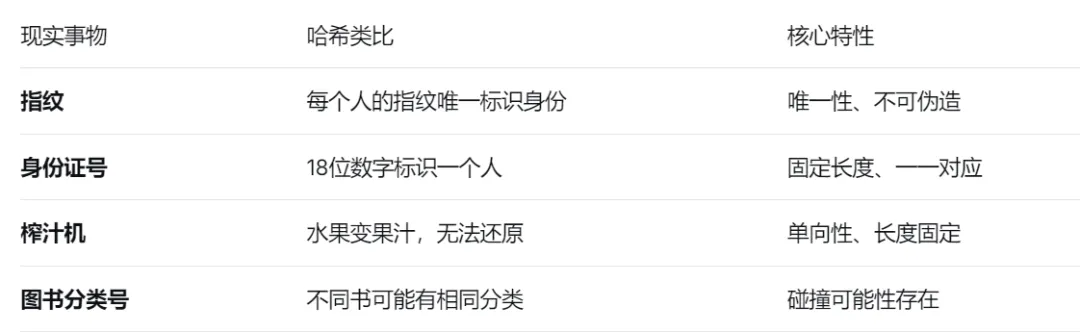 也就是说原密码字符串确定的情况下,无论调用hash算法多少次,生成的hash值是相同的。这与上一篇文章的随机数有本质区别,随机数是每次输出结果不同。也就是说根据hash值无论如何不能反推出原来的密码,这也是很重要的一个环节。如果加过密的内容,能够被反推出来,说明密码是失败的。比如两个不同的原文,经过加密算法处理之后,密文是否会存在一致的情况?MD5算法已经被证实可碰撞,在某种程度上是不安全的。但sha-256目前安全。即便两个有微小差异的字符串(比如多了一个!号),它们生成的哈希值几乎完全不同。2.3 生活中的哈希类比