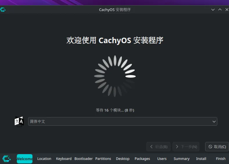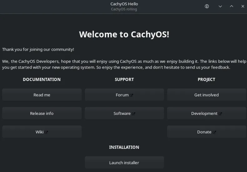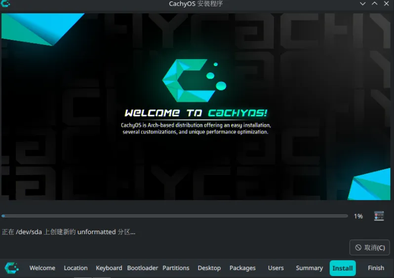 这里加载的很慢,成功加载后,点击最下方的Launch installer,进入安装模式。其他的按钮大多用于了解CachyOS Linux的一些信息。