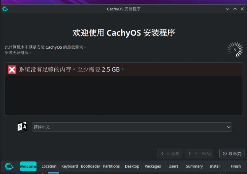 选择好语言以后,点击下一步出错了,虚拟电脑给到的内存不够,重新设置成4G内存大小,再次安装。
