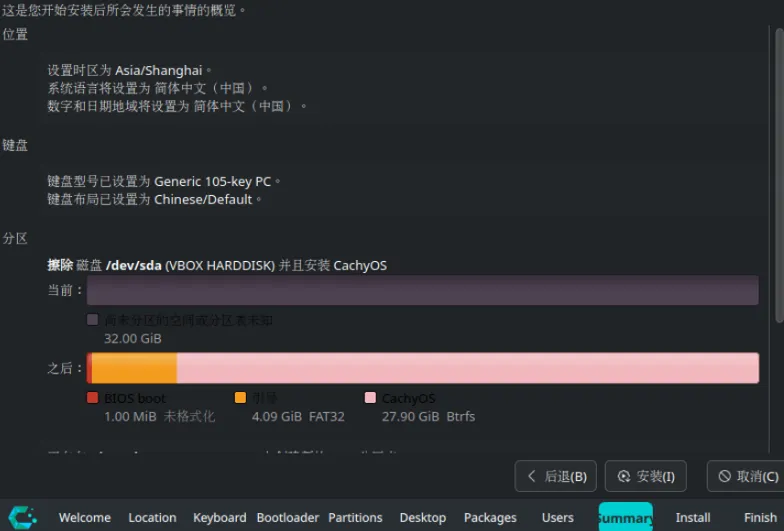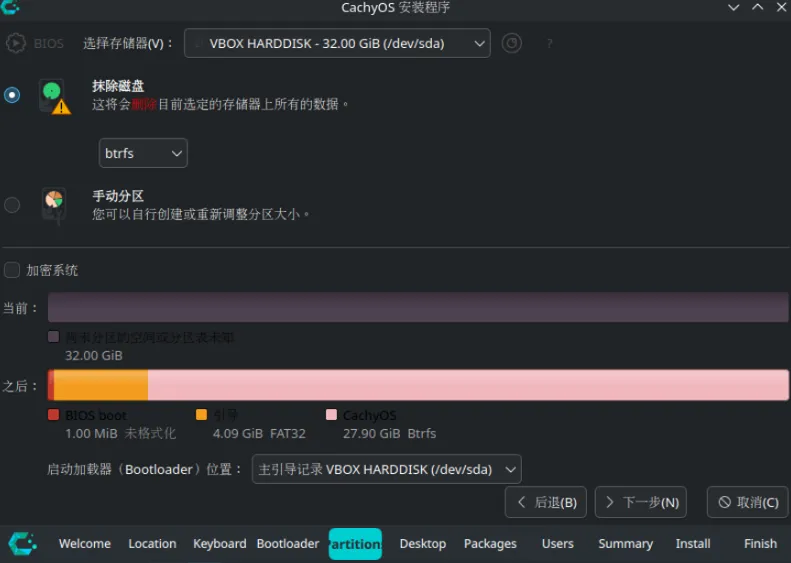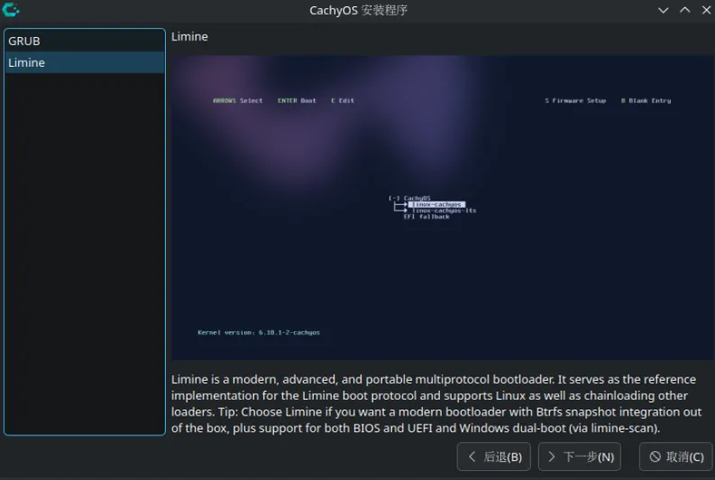 这里的系统引导启动设置,CachyOS Linux给到2个选择,一个是经典的GRUB,另一个是Limine,默认的推荐使用Limine,也就是用Limine了。