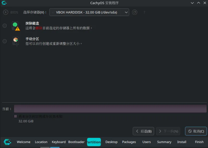 最关键的一步,设置系统分区,因为是在虚拟机中设置单独磁盘安装,这里就选择抹除磁盘自动分区,如果有数据的硬盘,务必确认设置好分区,一旦抹除后,很难进行恢复。