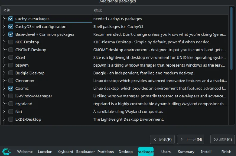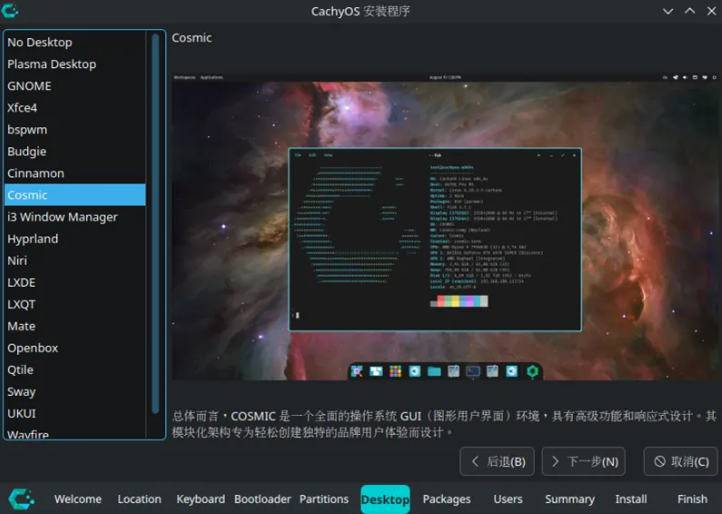 CachyOS Linux的安装桌面可选择的非常多,这里就选择COSMIC。其他设置根据自己的需求设定。