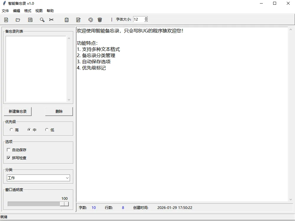 import tkinter as tkfrom tkinter import ttk, scrolledtext, messagebox, filedialog, colorchooserimport datetimeimport jsonimport osclass SmartMemoApp: def __init__(self): # 第1篇内容:创建主窗口 self.window = tk.Tk() self.window.title("智能备忘录 v1.0") self.window.geometry("1000x700+200+100") # 全局变量 self.current_file = None self.font_size = 12 self.text_color = "black" self.bg_color = "white" self.memos = [] # 初始化UI - 注意顺序:先创建组件,再设置菜单 self.setup_toolbar() # 第7篇:工具栏 self.setup_main_area() # 第2-6篇:主区域布局和组件(这里创建text_editor) self.setup_menu() # 第7篇:菜单系统(现在可以访问text_editor) self.setup_statusbar() # 状态栏 # 绑定事件 self.bind_events() def setup_menu(self): """设置菜单系统 - 第7篇内容""" menubar = tk.Menu(self.window) # 文件菜单 file_menu = tk.Menu(menubar, tearoff=0) file_menu.add_command(label="新建", accelerator="Ctrl+N", command=self.new_file) file_menu.add_command(label="打开", accelerator="Ctrl+O", command=self.open_file) file_menu.add_command(label="保存", accelerator="Ctrl+S", command=self.save_file) file_menu.add_command(label="另存为", command=self.save_as) file_menu.add_separator() file_menu.add_command(label="导出为JSON", command=self.export_json) file_menu.add_separator() file_menu.add_command(label="退出", command=self.quit_app) menubar.add_cascade(label="文件", menu=file_menu) # 编辑菜单 edit_menu = tk.Menu(menubar, tearoff=0) edit_menu.add_command(label="撤销", accelerator="Ctrl+Z", command=self.undo_text) edit_menu.add_command(label="重做", accelerator="Ctrl+Y", command=self.redo_text) edit_menu.add_separator() edit_menu.add_command(label="剪切", accelerator="Ctrl+X", command=self.cut_text) edit_menu.add_command(label="复制", accelerator="Ctrl+C", command=self.copy_text) edit_menu.add_command(label="粘贴", accelerator="Ctrl+V", command=self.paste_text) edit_menu.add_separator() edit_menu.add_command(label="查找", accelerator="Ctrl+F", command=self.find_text) edit_menu.add_command(label="替换", accelerator="Ctrl+H", command=self.replace_text) menubar.add_cascade(label="编辑", menu=edit_menu) # 格式菜单 format_menu = tk.Menu(menubar, tearoff=0) format_menu.add_command(label="字体颜色", command=self.change_text_color) format_menu.add_command(label="背景颜色", command=self.change_bg_color) format_menu.add_separator() # 字体大小子菜单 size_menu = tk.Menu(format_menu, tearoff=0) for size in [10, 12, 14, 16, 18, 20, 24]: size_menu.add_command( label=f"{size}pt", command=lambda s=size: self.change_font_size(s) ) format_menu.add_cascade(label="字体大小", menu=size_menu) menubar.add_cascade(label="格式", menu=format_menu) # 视图菜单 view_menu = tk.Menu(menubar, tearoff=0) self.sidebar_var = tk.BooleanVar(value=True) self.statusbar_var = tk.BooleanVar(value=True) view_menu.add_checkbutton(label="显示侧边栏", variable=self.sidebar_var, command=self.toggle_sidebar) view_menu.add_checkbutton(label="显示状态栏", variable=self.statusbar_var, command=self.toggle_statusbar) menubar.add_cascade(label="视图", menu=view_menu) # 帮助菜单 help_menu = tk.Menu(menubar, tearoff=0) help_menu.add_command(label="使用说明", command=self.show_help) help_menu.add_command(label="关于", command=self.show_about) menubar.add_cascade(label="帮助", menu=help_menu) self.window.config(menu=menubar) # 第7篇:右键弹出菜单 self.setup_context_menu() def setup_context_menu(self): """设置右键菜单""" self.context_menu = tk.Menu(self.window, tearoff=0) self.context_menu.add_command(label="剪切", command=self.cut_text) self.context_menu.add_command(label="复制", command=self.copy_text) self.context_menu.add_command(label="粘贴", command=self.paste_text) self.context_menu.add_separator() self.context_menu.add_command(label="全选", command=self.select_all) # 绑定右键事件 self.text_editor.bind("<Button-3>", self.show_context_menu) def show_context_menu(self, event): """显示右键菜单""" try: self.context_menu.tk_popup(event.x_root, event.y_root) finally: self.context_menu.grab_release() def undo_text(self): """撤销""" try: self.text_editor.edit_undo() except: pass def redo_text(self): """重做""" try: self.text_editor.edit_redo() except: pass def cut_text(self): """剪切""" self.text_editor.event_generate("<<Cut>>") def copy_text(self): """复制""" self.text_editor.event_generate("<<Copy>>") def paste_text(self): """粘贴""" self.text_editor.event_generate("<<Paste>>") def select_all(self): """全选""" self.text_editor.tag_add('sel', '1.0', 'end') def setup_toolbar(self): """设置工具栏 - 第7篇内容""" toolbar = tk.Frame(self.window, relief=tk.RAISED, bd=1) toolbar.pack(side=tk.TOP, fill=tk.X) # 工具栏按钮 buttons = [ ("📄", "新建", self.new_file), ("📂", "打开", self.open_file), ("💾", "保存", self.save_file), ("🔍", "查找", self.find_text), ("✂️", "剪切", self.cut_text), ("📋", "复制", self.copy_text), ("📝", "粘贴", self.paste_text), ("🎨", "颜色", self.change_text_color), ("🗑️", "清空", self.clear_text) ] for icon, tooltip, command in buttons: btn = tk.Button(toolbar, text=icon, command=command, relief=tk.FLAT, width=3, font=("Arial", 12)) btn.pack(side=tk.LEFT, padx=2, pady=2) # 简单工具提示 self.create_tooltip(btn, tooltip) # 添加一个分隔符 tk.Label(toolbar, text="|").pack(side=tk.LEFT, padx=5) # 添加字体大小选择 - 第6篇:Spinbox组件 tk.Label(toolbar, text="字体大小:").pack(side=tk.LEFT, padx=2) self.size_spin = tk.Spinbox( toolbar, from_=8, to=72, width=5, validate='key', validatecommand=(self.window.register(self.validate_spinbox), '%P') ) self.size_spin.delete(0, tk.END) self.size_spin.insert(0, str(self.font_size)) self.size_spin.bind("<<Increment>>", lambda e: self.on_font_size_change()) self.size_spin.bind("<<Decrement>>", lambda e: self.on_font_size_change()) self.size_spin.bi