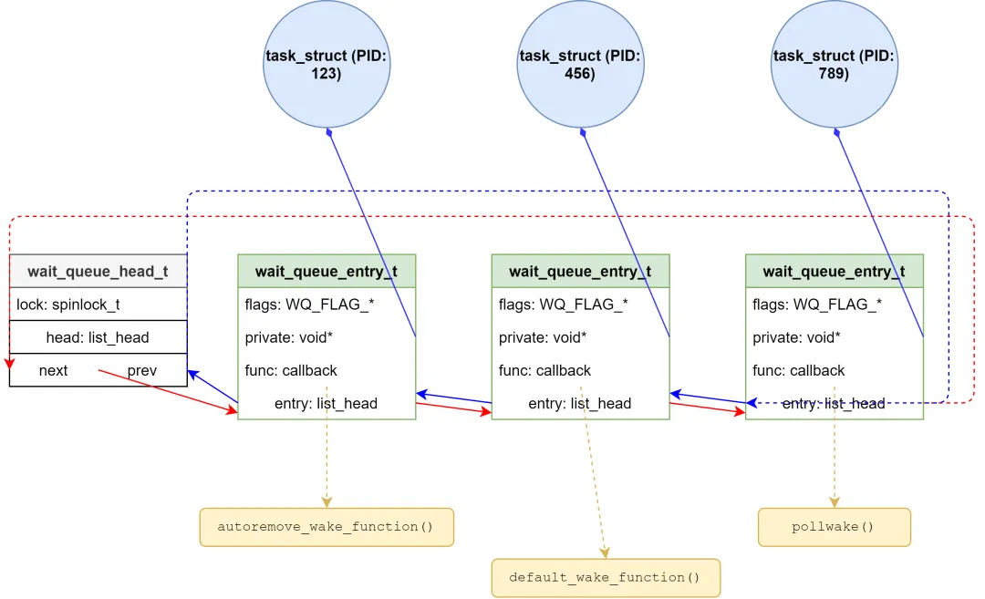 Linux内核中,阻塞IO的实现依赖等待队列(Wait Queue)——它是内核中用于同步进程与资源的基础机制,与进程调度紧密结合,信号量、互斥体等同步机制在底层也依赖等待队列实现。