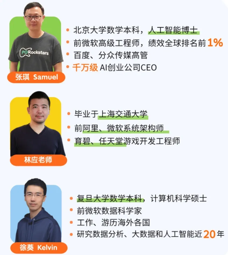 课程设计者全部来自北大、复旦、交大等顶尖学府,专业覆盖数学、计算机、人工智能。