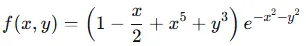 - 由于网格只有 16×16 个点,图像较粗糙,但能大致看出函数的形状:中心区域由于指数衰减而较暗,四周因多项式项影响有起伏。