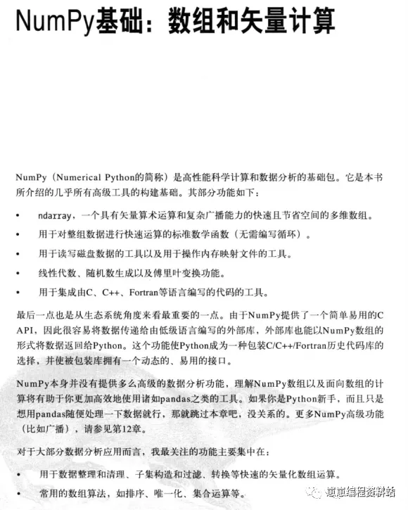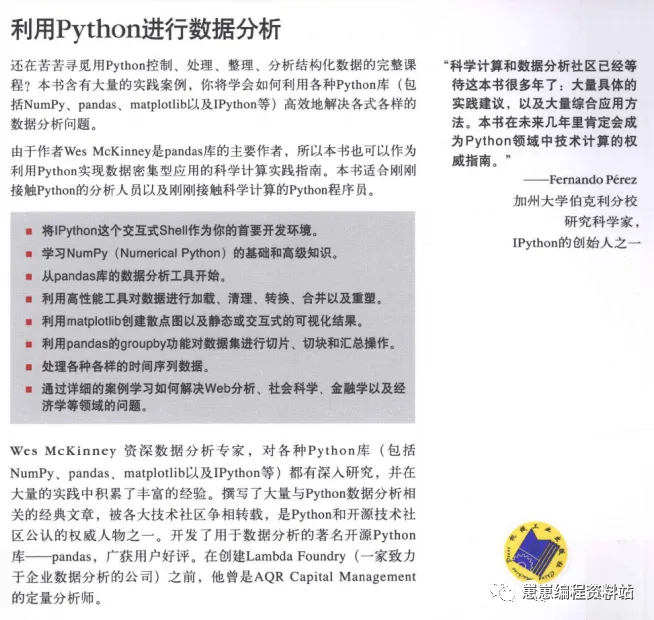 这是非常经典的一本Python数据分析书,每一章之间有递进关系,适合Python入门()如《Python编程,从入门到实践》)之后阅读,本书专门针对数据分析领域的。我细致地读了一遍,敲了一遍代码,一开始没有头绪,进展缓慢,后来逐渐明朗了。学习编程要多实践,这对没有基础的人来说有困难,因为无从下手。我的体会是,在你基础不牢的时候,就多看,多记,多总结,搭建自己的思路框架。