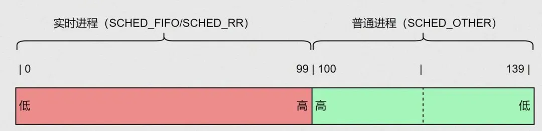 普通进程是咱们最常接触的,静态优先级范围100~139,和nice值挂钩(静态优先级=120+nice值),nice值越小,优先级越高。比如把浏览器的nice值设为-5,它的静态优先级就是115,比默认nice=0(静态优先级120)的进程更容易抢到CPU。