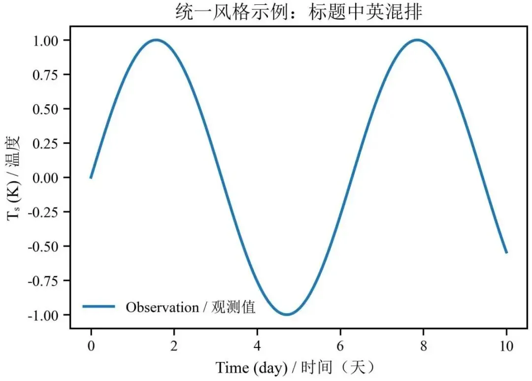 import numpy as npimport matplotlib.pyplot as pltx = np.linspace(0, 10, 200)y = np.sin(x)fig, ax = plt.subplots()ax.plot(x, y, label="Observation / 观测值")ax.set_title("统一风格示例:标题中英混排")ax.set_xlabel("Time (day) / 时间(天)")ax.set_ylabel("Tₛ (K) / 温度")ax.legend()fig.savefig("style_demo.jpg")plt.close(fig)